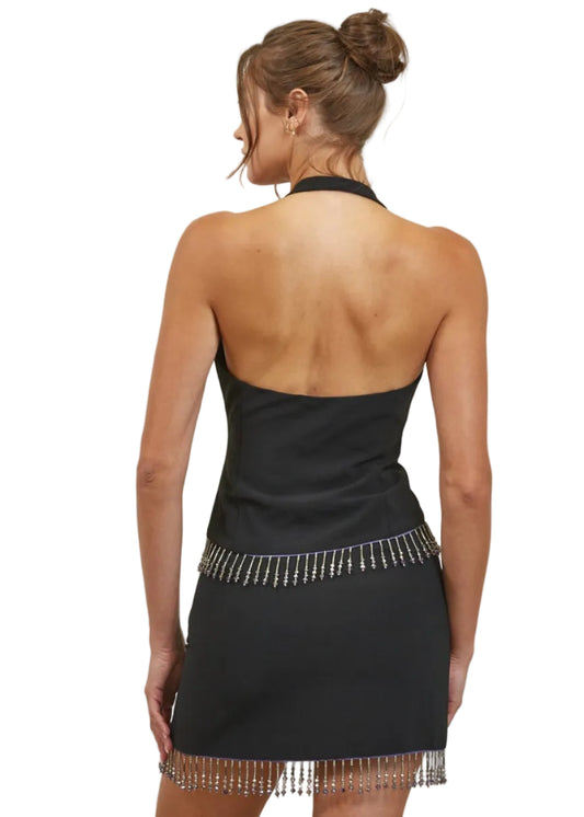 Beaded Fringe Hem Halter Neck Woven Top