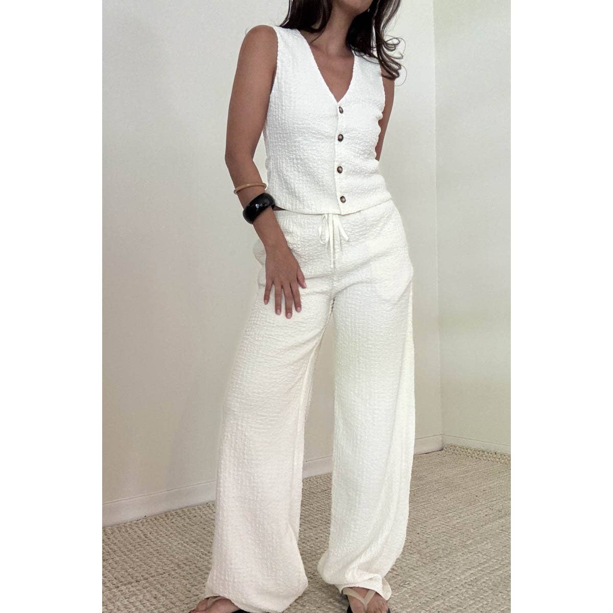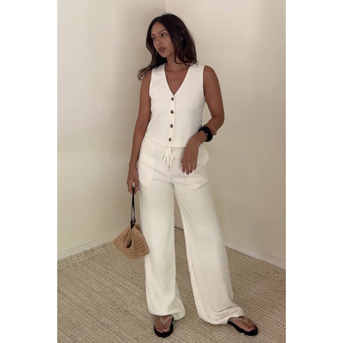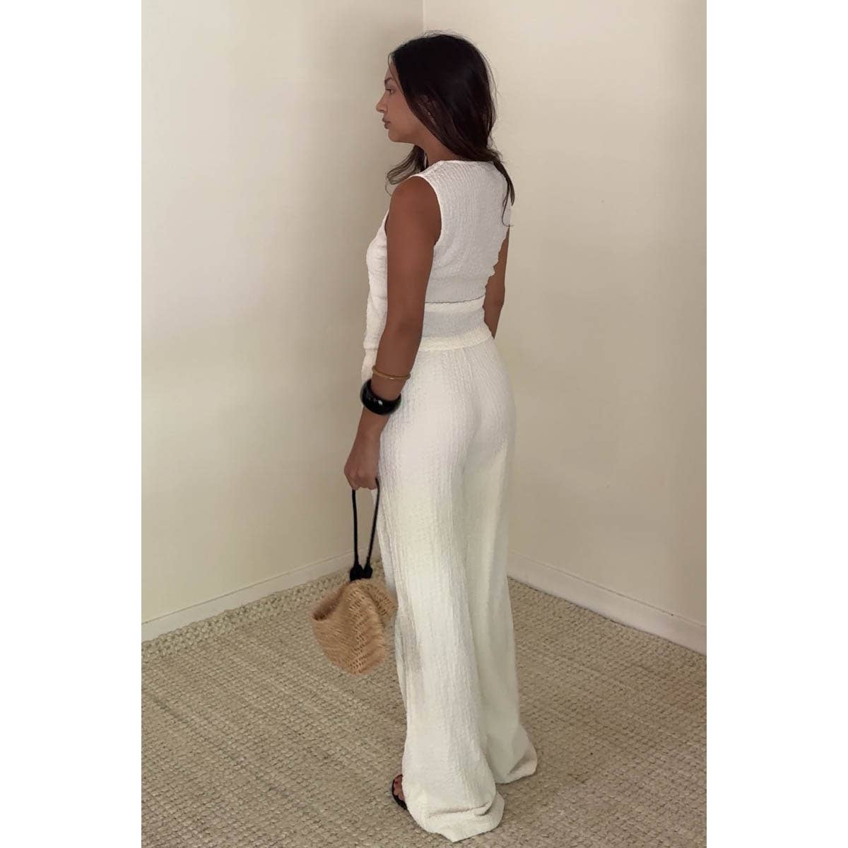 - Paired with high-rise wide leg pants designed with an elastic waistband and practical side pockets, this set offers both structure and comfort.
