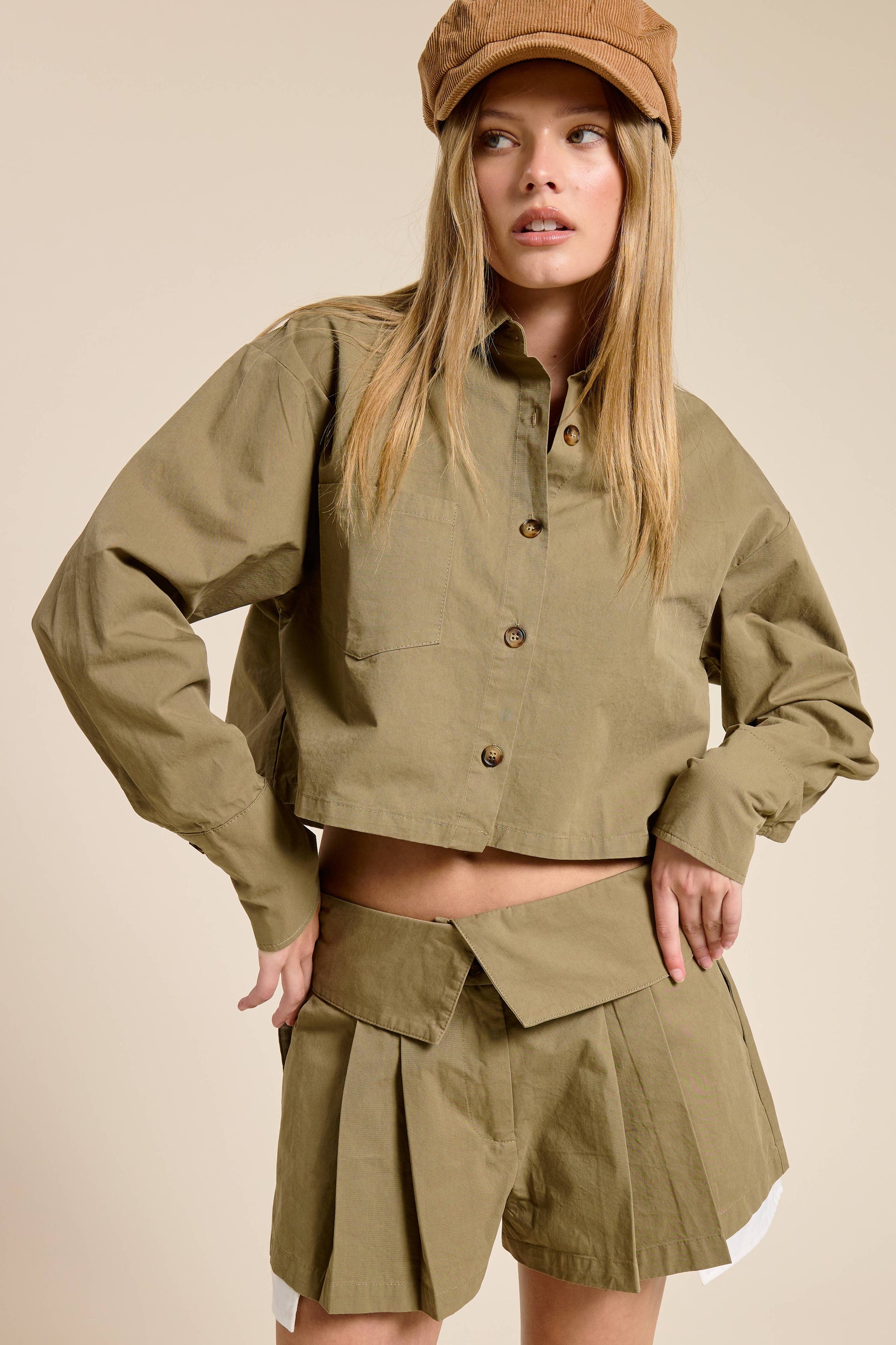 - The cropped button-down shirt features a boxy fit, classic collar, buttoned cuffs, and a chest pocket